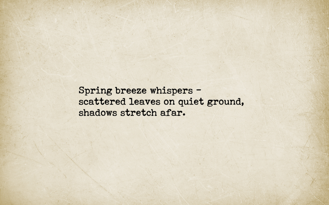 Mar 27, 2025 | PneumalithSpring breeze whispers – scattered leaves on quiet ground, shadows stretch afar.